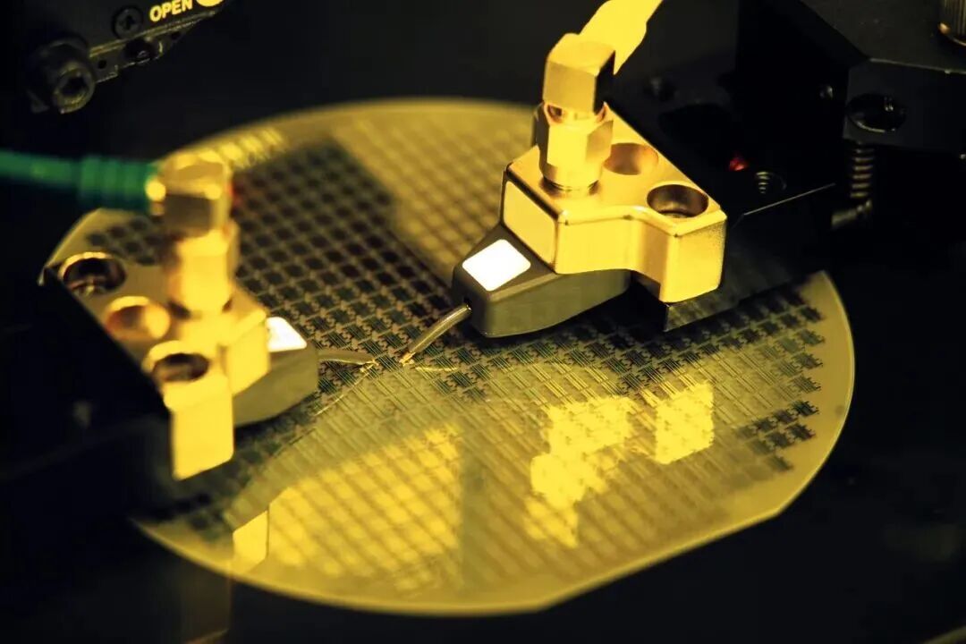 晶圆切割前的探针测试环节,用于筛选出合格的存储芯片丨veer图库