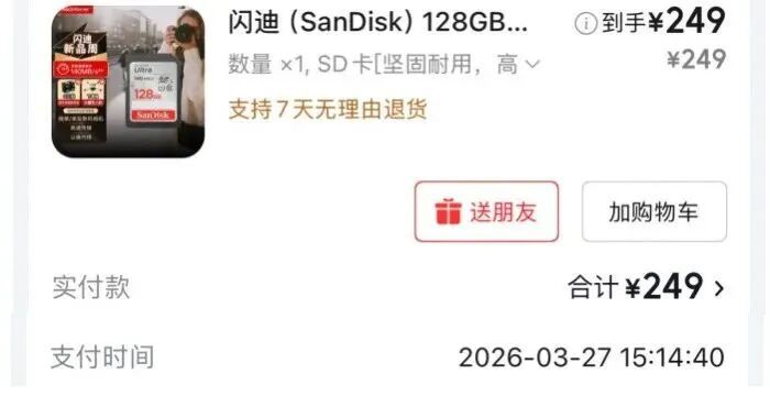 一款闪迪SD卡的价格在一年时间里翻了将近三倍