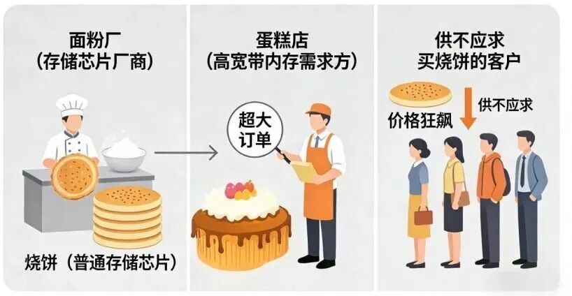 我们可以做一个比喻来说明问题:存储芯片的生产厂商就像面粉厂,平时主营业务是做烧饼(普通存储芯片)。突然有一家卖蛋糕的店找过来,花重金下了一个超大的订单,要做一大批蛋糕(高宽带内存),那面粉厂肯定要把大部分现有的面粉都拿去做利润更高的蛋糕,烧饼做的就少了。然而,买烧饼的客户没变,那烧饼自然就供不应求、价格一路狂飙了。