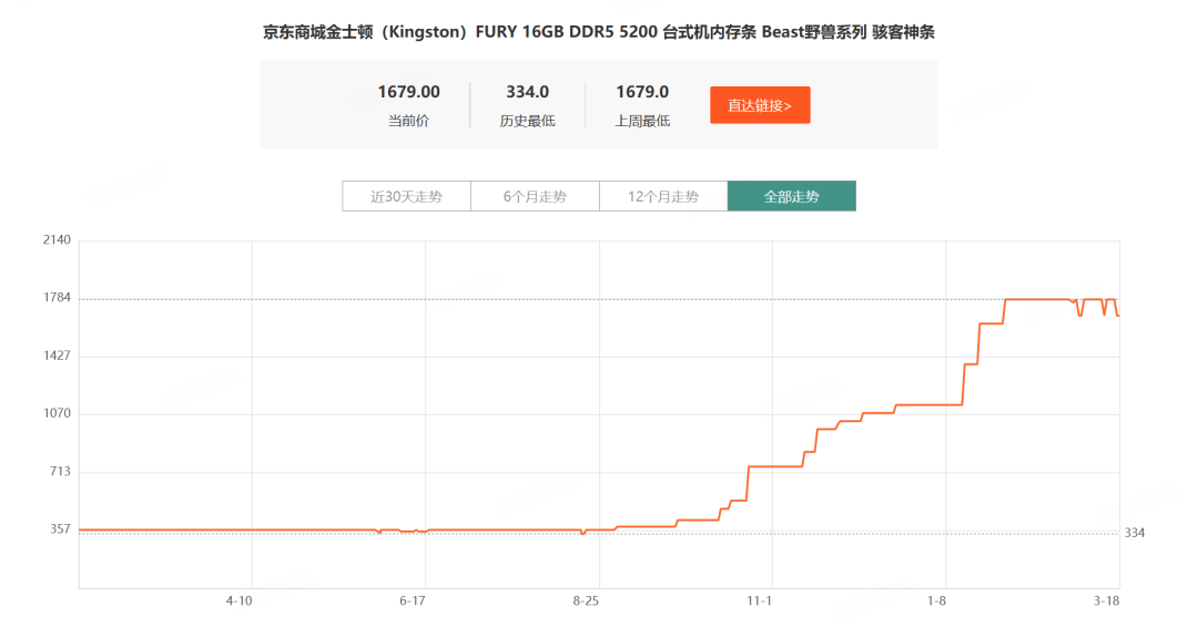 看看下面这款台式机内存条,今年3月中旬的价格是1679元,而在半年前只要357元就能入手——这涨价的曲线,谁看了不迷糊?妥妥的理财产品啊!