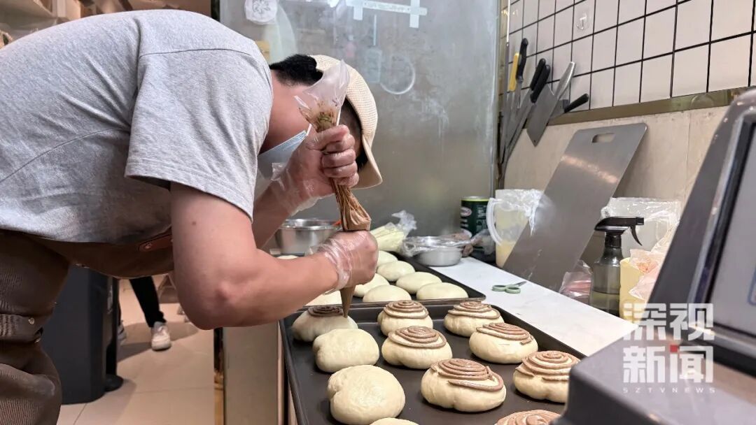 今天早上6点半左右,媒体来到面包店看到,店员们正在制作新鲜的面包,挤奶油、刷蛋液、烘烤......忙得不亦乐乎,烘焙特有的麦香在店内肆意弥漫,让空气也变得温暖、香甜。